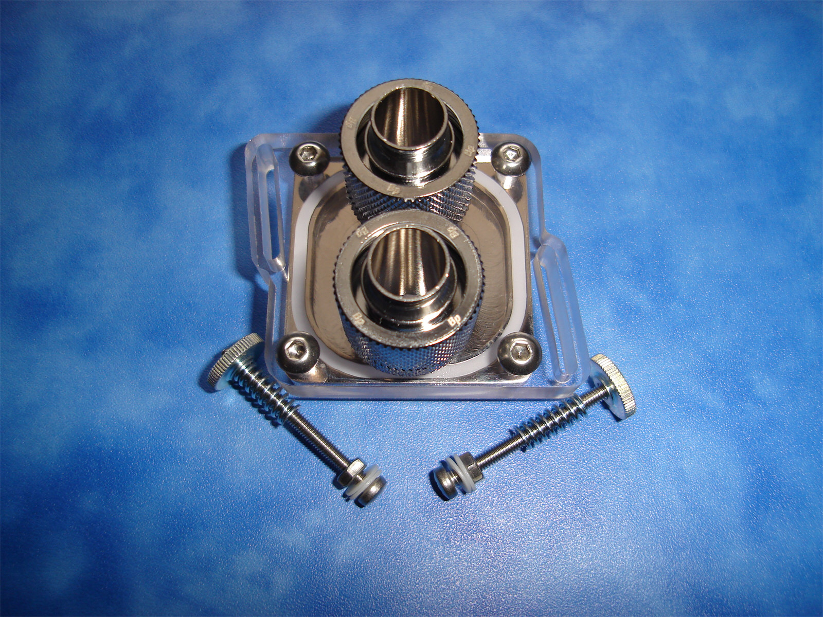 Rozměry poniklované základny bloku jsou 43x43x5mm. Pro TOP je použit polykarbonát tloušťky 9.5mm. Rozteč pro uchycení k základní desce je 47-66mm.